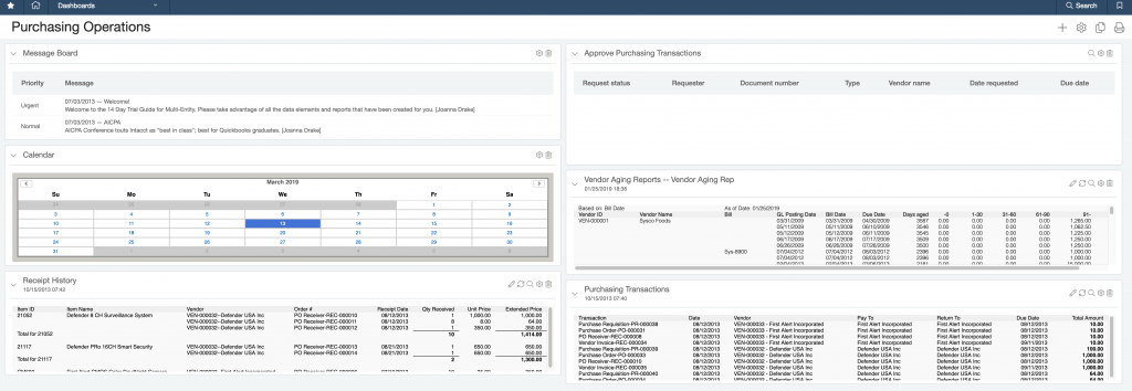 Sage Intacct Dashboards allow you to closely monitor the most important parts of your business. Each dashboard consists of components like calendars, graphs, lists (customers, invoices, locations, etc.), news feeds, performance cards, reports, and shortcut links. You can create as many dashboards as you’d like and control who has access to them.