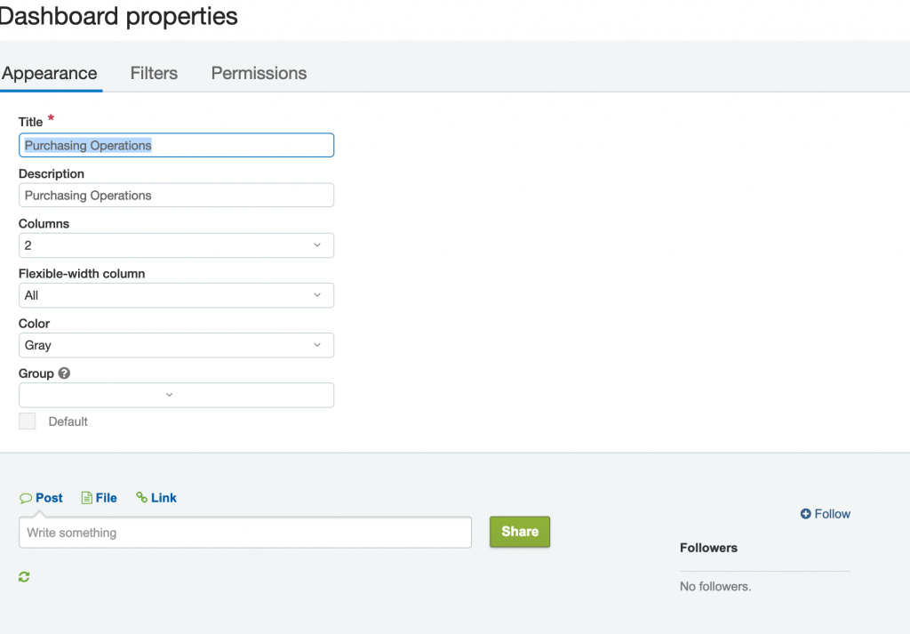 To copy an existing dashboard, go to the dashboard you’d like to use as the model. In the upper right, click the pages icon. In the Dashboard properties window, enter a new Title. Set up the Appearance, Filters, and Permissions. Click Save.