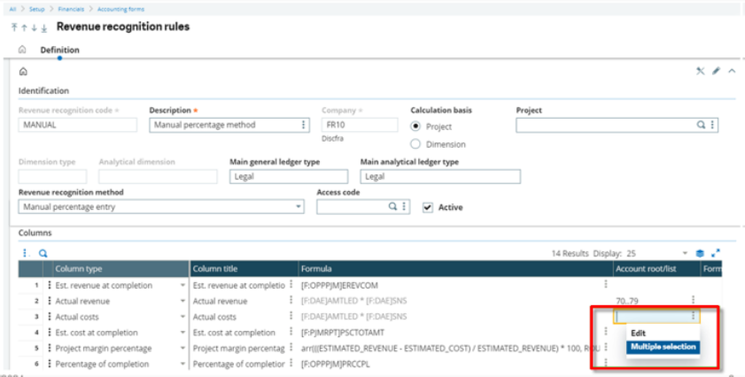 Several enhancements have been introduced in the finance module to streamline revenue recognition. This includes an enhanced way to define accounts for Actual revenue and/or Actual cost Column types. Based on the calculation basis chosen, a new window opens that lists all accounts in the main general ledger or main general analytical ledger.